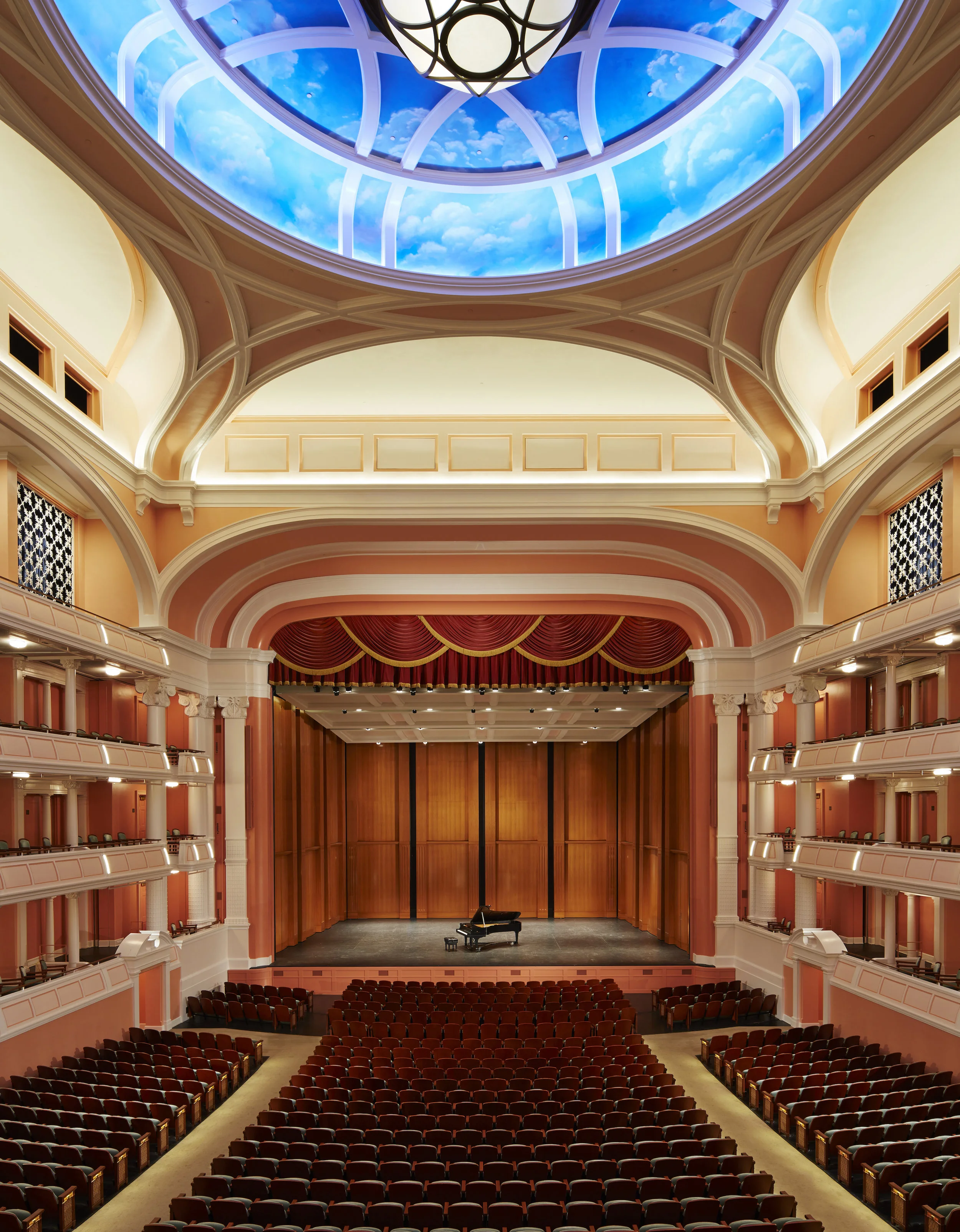 Echoing the design of Europe’s great opera houses, the performance hall features an oval-shaped orchestra level with two center aisles and three tiers of horseshoe-shaped balconies to enhance acoustics and bring audiences closer to the stage. The second level features beautifully designed opera boxes.